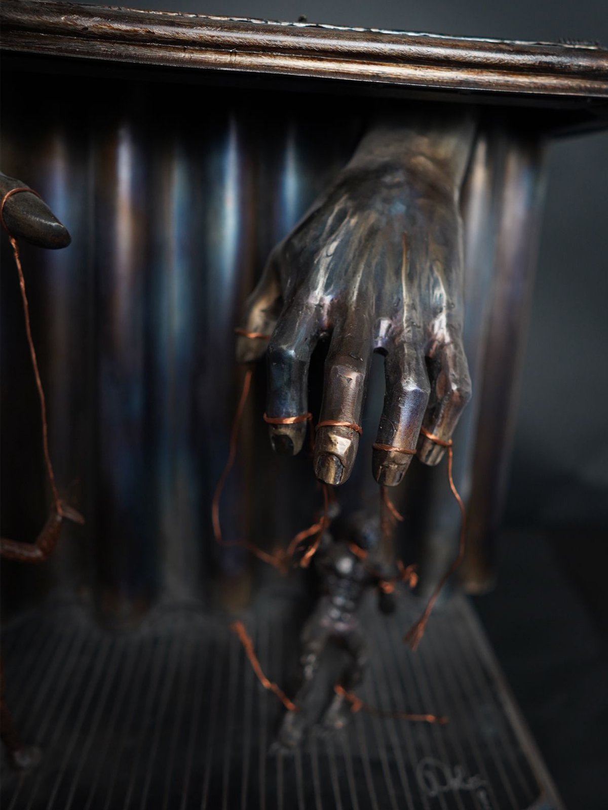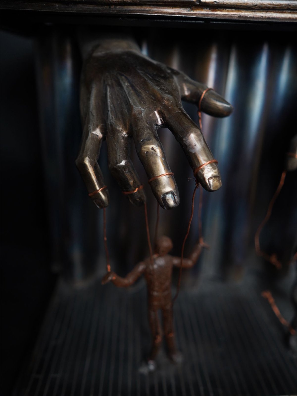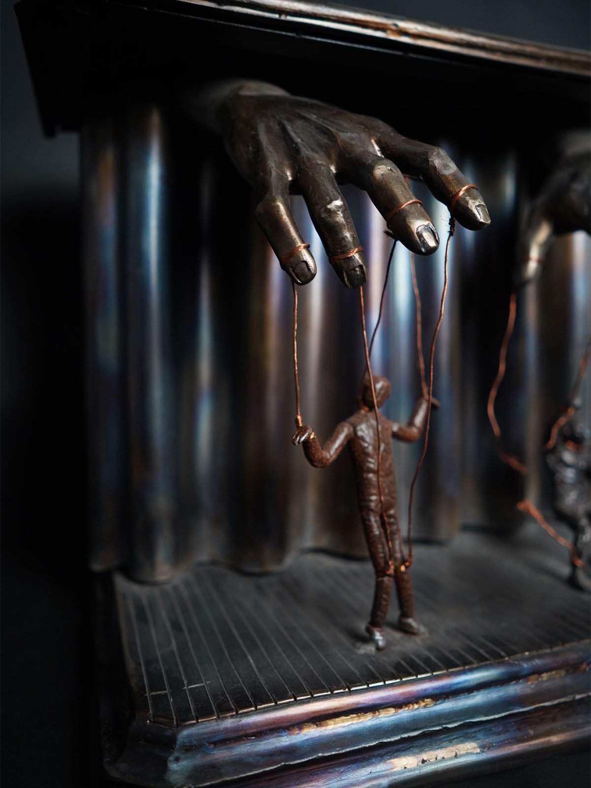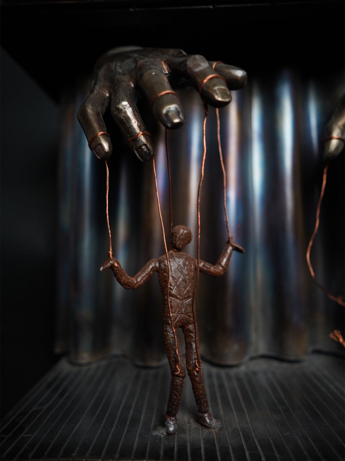 Sotto le luci del palco, due marionette danzano al ritmo di fili invisibili. Una rimane prioniera delle corde, eterna schiava del controllo. L’altra, con un gesto di ribellione, spezza le catene e si erge libera, finalmente umana. La sua ombra si allunga, simbolo di una nuova vita, di una scelta coraggiosa. Le mani che un tempo la manovravano ora restano vuote, impotenti di fronte alla forza della libertà.